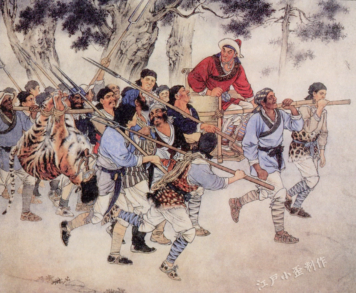 这是武松一战成名后被抬走的欢庆场面。不仅是武松,所有的猎户神态姿势各不一样,细入毫发。