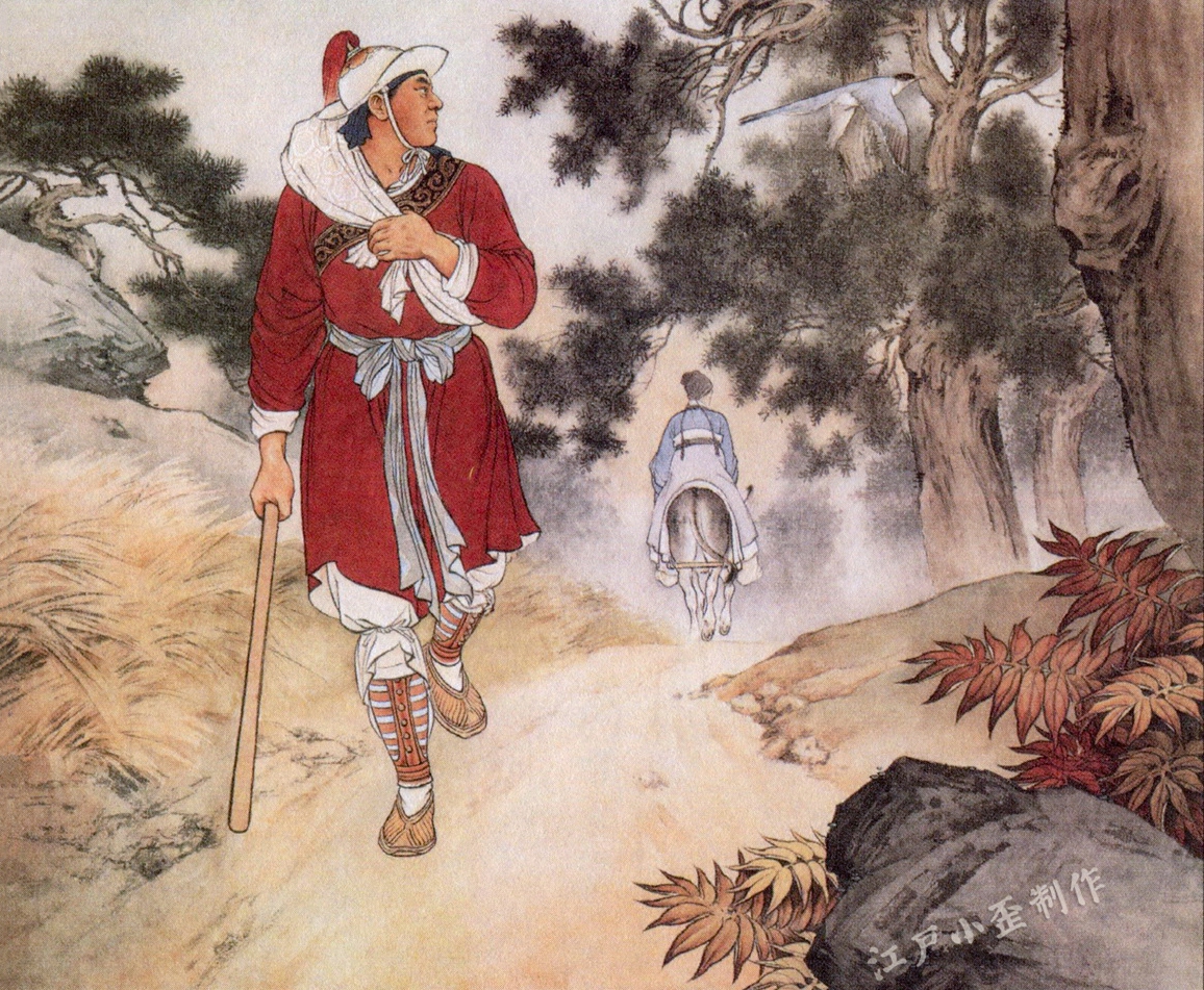 画面浓浓的秋意,草木枯黄,松林浓密,让人预感接下来不会有啥好事发生。武松疑神疑鬼的望着后方,显然他也比较在意酒店老板的提醒:有虎,悠着点!有趣的彩蛋出现了,东郭先生骑着驴,与武松背道而驰,刘大师难得把他笔下两大不同时空的经典人物进行碰撞!