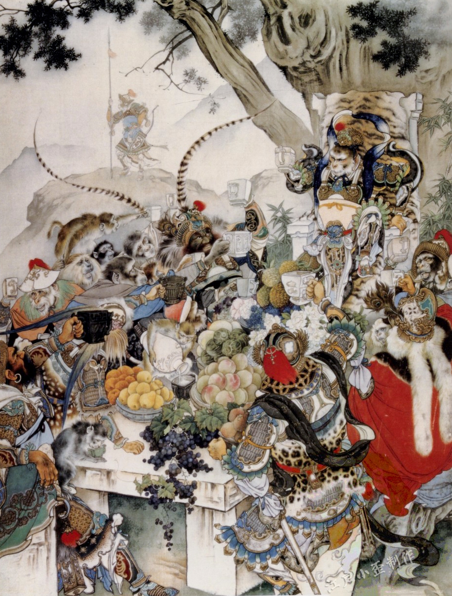 小时候我看到一本盗版西游记文字书,里面排版印刷得一塌糊涂,可我毫不犹豫买下了,因为那本书就是拿了这张图做了封面。花果山一派热闹气象,瓜果盈盆,大家都举起白玉杯来畅爽开怀。这个欢庆场面后来成了画家们的教科书:孟庆江的《英雄排座次》封面,李云中的《水帘洞》封面都可以看到类似的姿态和同款的白玉杯。